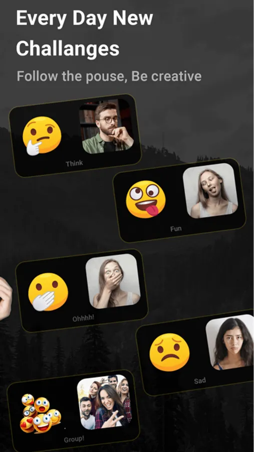 Facefy comes with new face challenges everyday. Facefy send notification with challenge to everyone at same time ( once a day ) and user have chance to capture within 3 minute. To discover others real challenges user have must to capture his/her challenge.