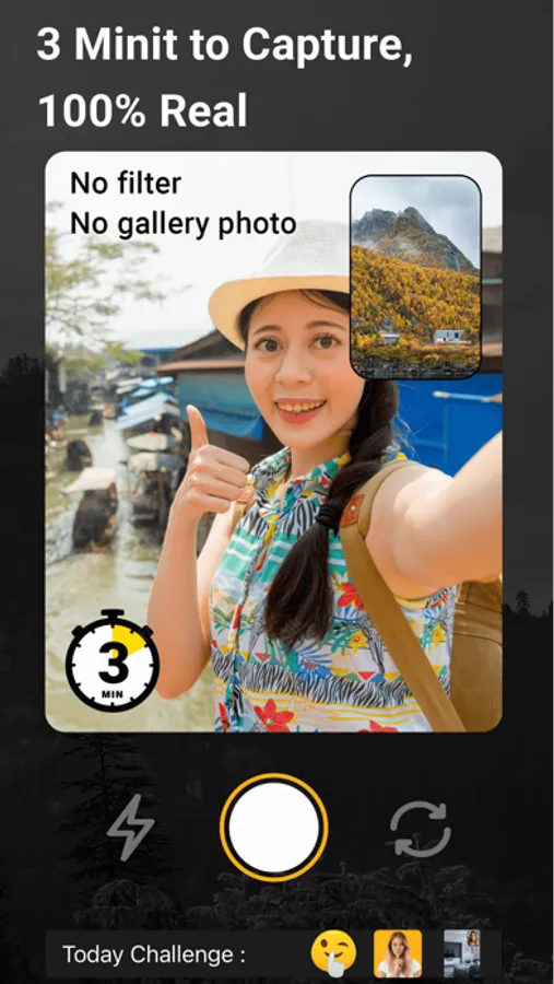 No filter, no gallery photo only real time face challenge with real place. its fun to see others photo because all user send their real place photo with back camera so some user at office some at garden, its fun to see user activity.