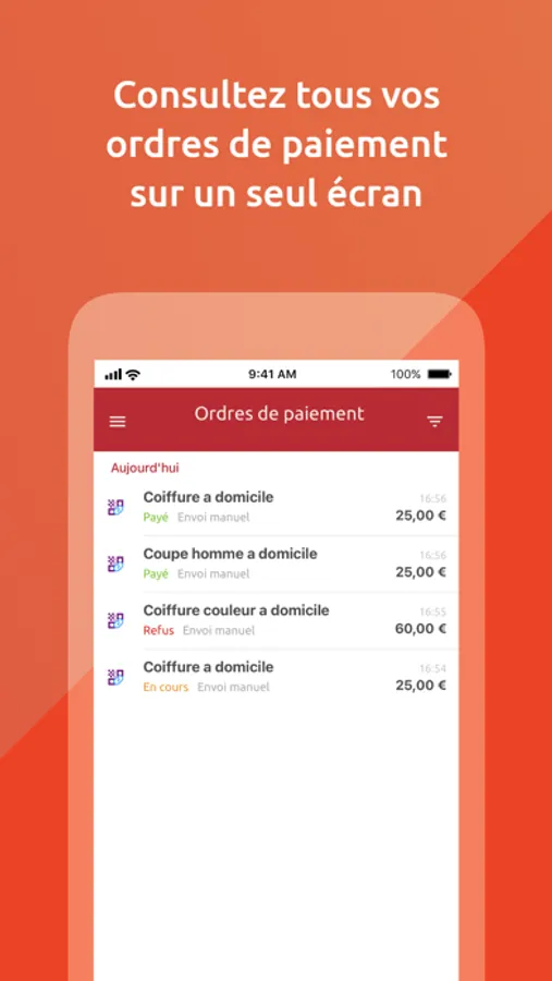 Suivez le statut des encaissements de vos ordres de paiement par carte (en attente, accepté ou refusé), retrouvez votre historique de transactions et filtrez ces derniers par référence/nom, date, prix, etc.