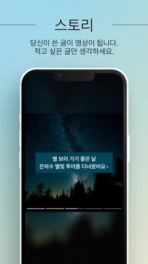 - 스토리는 숏폼 영상 콘텐츠 서비스로 사용자 개인의 글을 영상화 하여 작품으로 만들어 주는 서비스입니다.