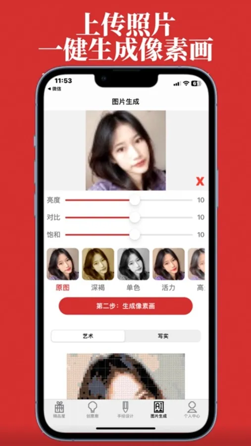 ○ 可一键将自己设计或优秀作者授权的像素画,定制成自己喜爱的积木画、钻石画十字绣、T恤、杯子、文具等;