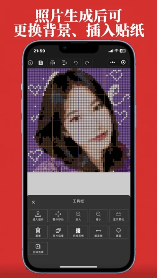 ○ 上传照片一键生成像素画,还可更换背景,插入各种组件贴纸,可为心爱的ta设计一幅有趣有爱的专属像素画;
