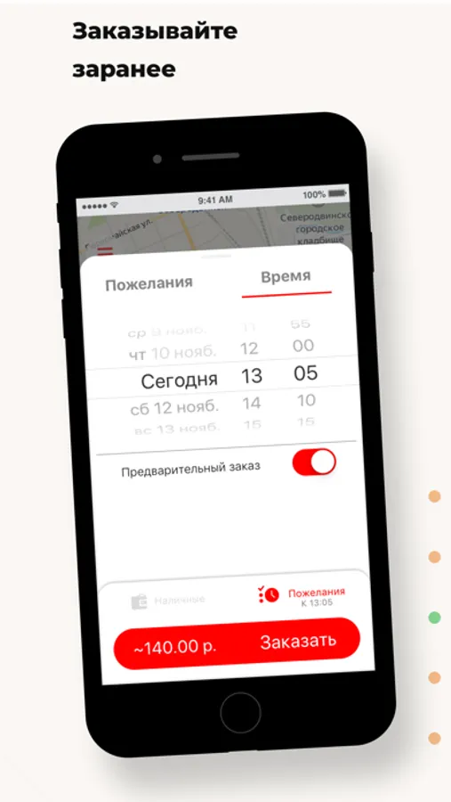 Выберите опцию “Предварительный заказ”. Поиск автомобиля начнется незадолго до заказа поездки, и автомобиль приедет к назначенному времени. Также вы будете заранее знать стоимость поездки.