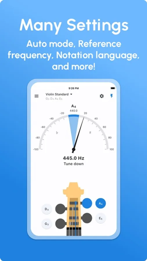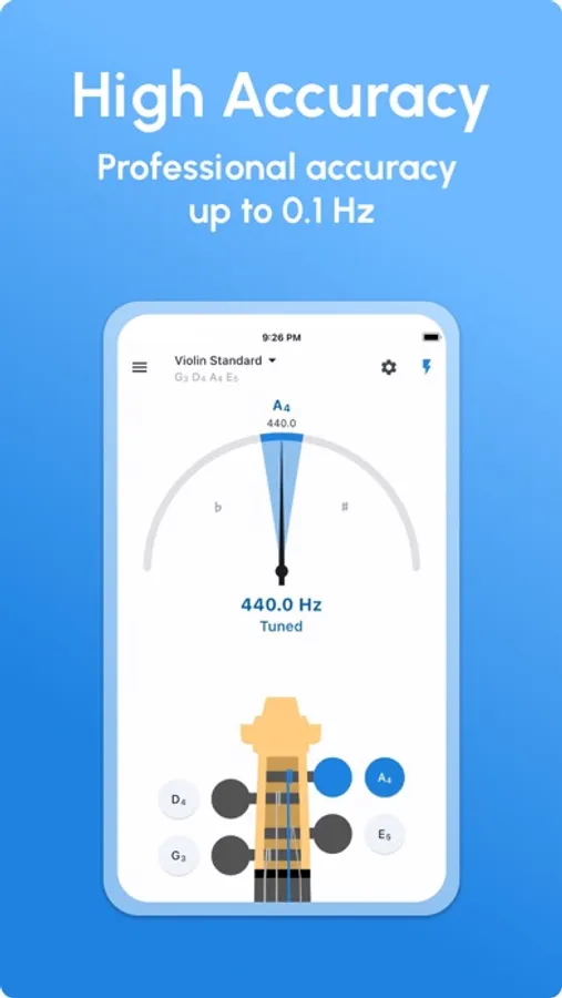 Tune the violin faster with the automatic mode. You can play any note, and we will properly detect it to give you hints on how to tune a violin.