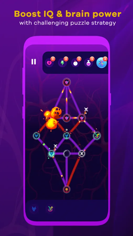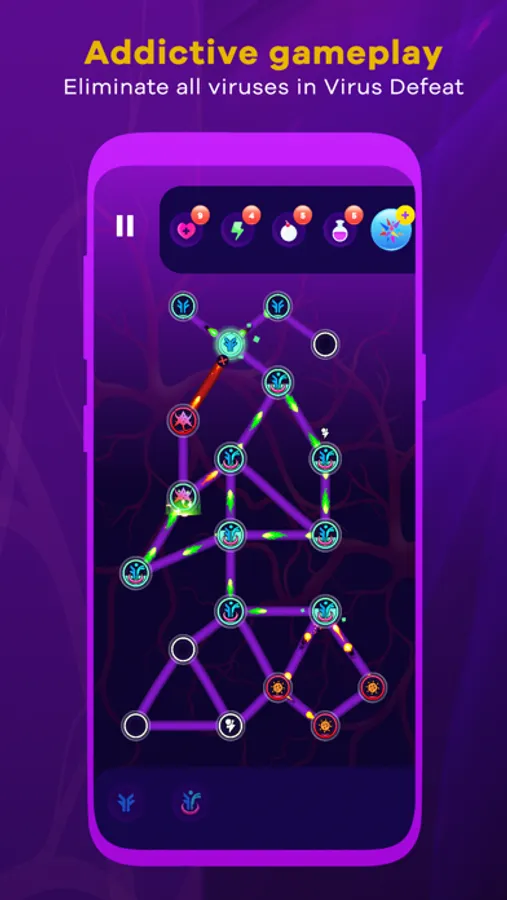 Introducing Virus Defeat - an addictive & challenging strategy puzzle game, that will test your intellect. The game is all about fighting against the viruses as Antibody in challenging levels, you'll need to use all of your strategy skills to break through and eliminate all the viruses on each level. To help you out, you'll have 5 power-ups: