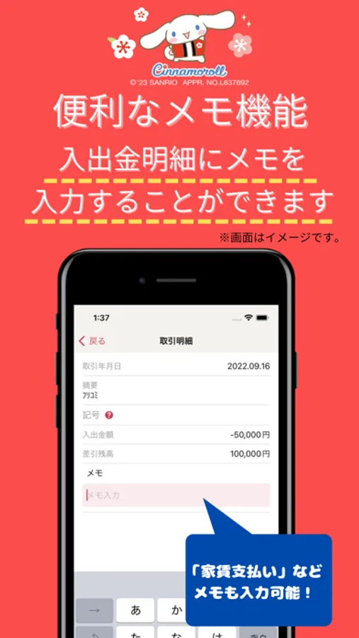 窓口やATMへ出向くことなく最新の入出金明細が確認できます。さらに、明細の絞り込み検索やメモ入力等の便利な機能もご利用いただけます。