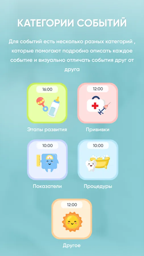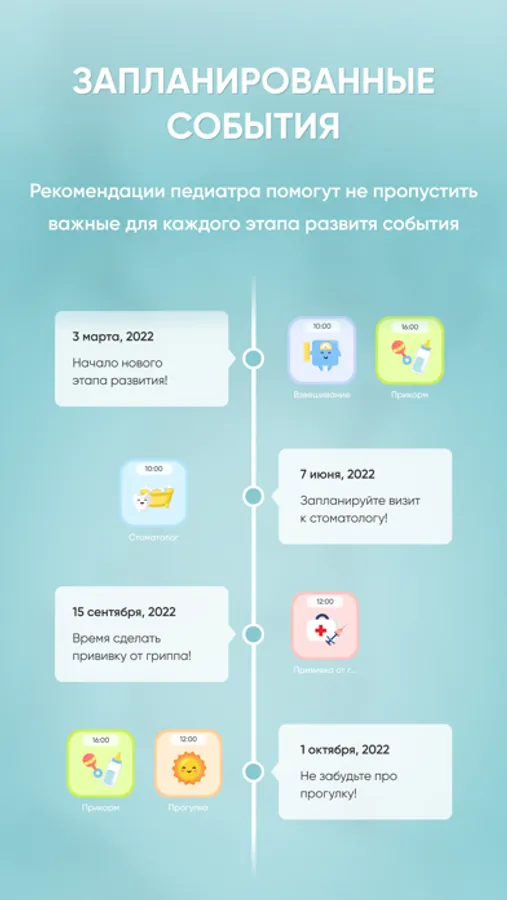 MyChildApp позволяет вам добавлять свои события в календарь ребенка, такие как посещение занятий, дневной сон, поход в гости, и др. Специальный тип событий, “Показатели”, дает возможность сохранять вес, рост, и обхват головы ребенка в календаре. В профиле ребенка будут доступны графики изменения показателей, а приложение выдаст оповещение, если введенные значения выходят за рамки принятые ВОЗ.
