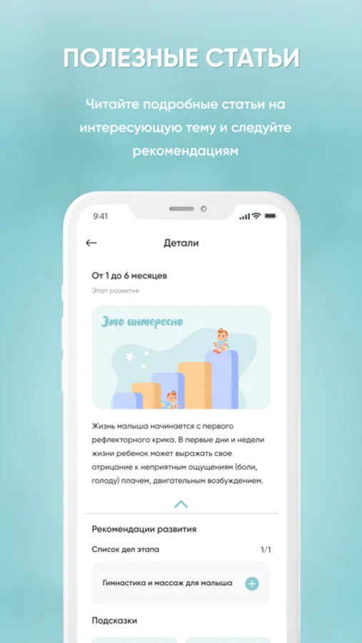 MyChildApp содержит библиотеку знаний, в которой есть статьи и подсказки по развитию ребенка, сну, прикорму, гигиене, и т.д. Также в приложении сохранены календари плановых медицинских процедур и прививок. При создании профиля ребенка приложение автоматически расставит плановые события в правильные даты в календаре вашего малыша. Наши эксперты регулярно обновляют содержание имеющихся статей и добавляют новые статьи в библиотеку.