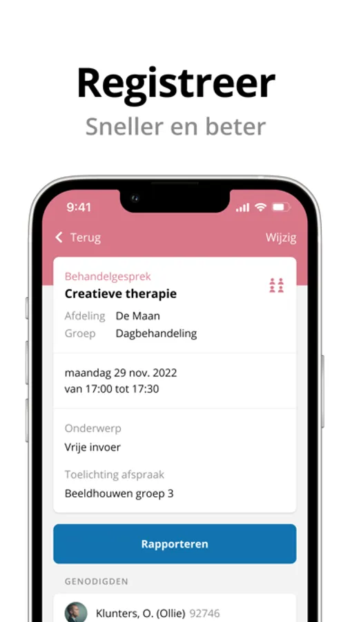 Registreer overal snel en eenvoudig je afspraken. De app vult alle relevante informatie voor je in die alleen gecontroleerd en aangevuld dient te worden.