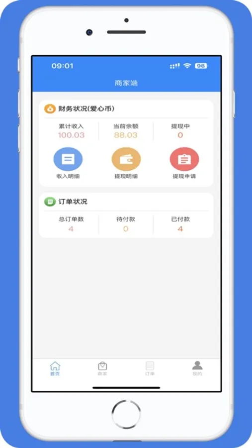呈现店铺的经营数据分析、订单数据汇总等功能。可查看具体的收入和提现明细信息。商家获得的爱心币可以提现到银行卡或转赠给用户进行消费。