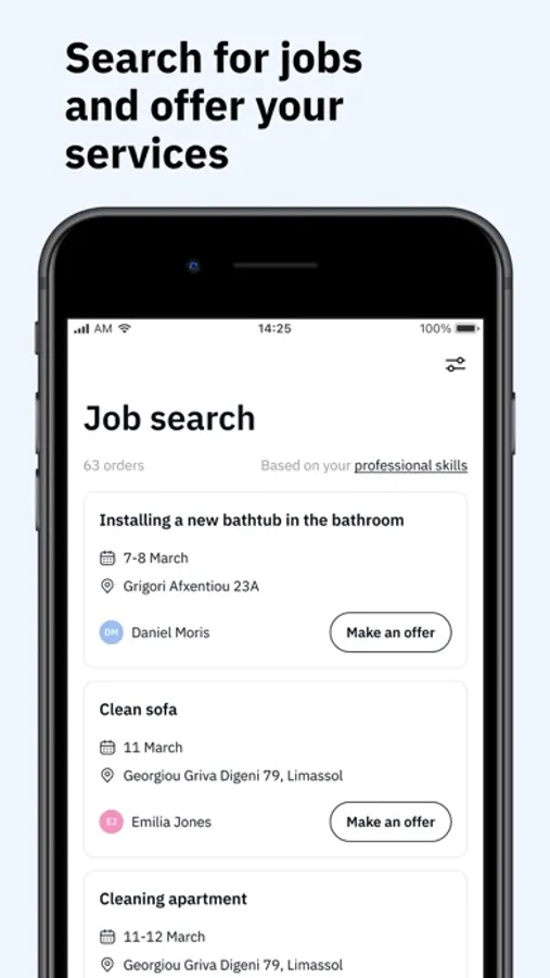 As a service provider in Cyprus, you can join our platform and offer your services to potential clients, no matter which city you're based in. Build your portfolio with clients reviews and become a trusted professional in your local area. Our platform also ensures that you get paid immediately after completing a job, making it a hassle-free experience.