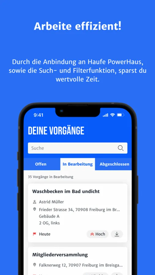 Die PowerHelfer-App ist die ideale Lösung für Immobilienprofis, die mobil arbeiten und stets über alle wichtigen Informationen verfügen möchten. Die App ist an das ERP-System Haufe PowerHaus angebunden und ermöglicht es Anwender:innen, Vorgänge direkt vor Ort zu erfassen und mit PowerHaus zu synchronisieren. Auch ohne Internetverbindung, wie im Keller oder in Tiefgaragen, können technische Vorgänge erfasst werden, damit keine wichtigen Informationen verloren gehen. Mit der PowerHelfer-App haben Objektbetreuer:innen und Techniker:innen alle relevanten Informationen immer zur Hand.