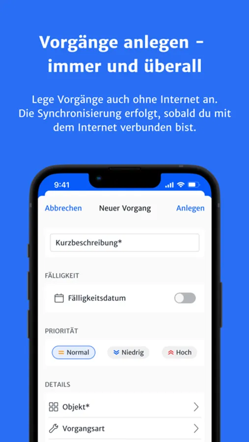 - Offline-Funktion: Für die Erfassung von Vorgängen und Informationsbeschaffung ohne Internetverbindung