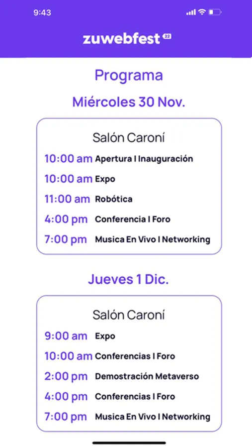 Aplicación oficial del zuWebFest, es un evento tecnológico creado en el 2018 y fue diseñado para dar a conocer estrategias y herramientas que contribuyan con el desarrollo de marcas, profesionales y estudiantes en materia de transformación digital, partiendo de casos reales, metodologías y apoyo técnico, con especialistas reconocidos en el área.