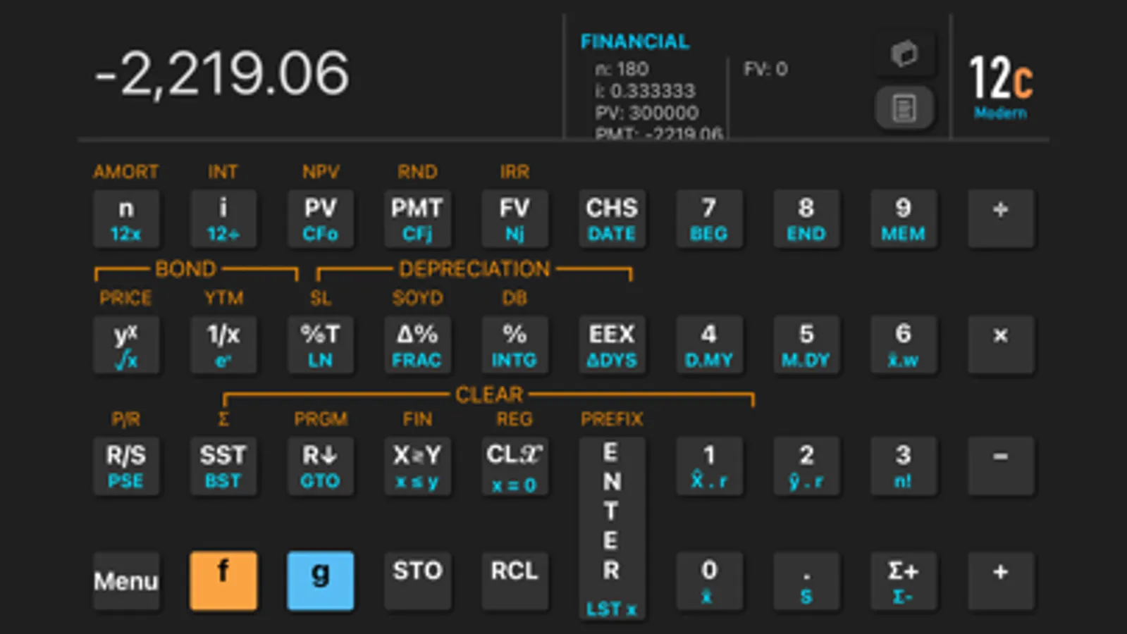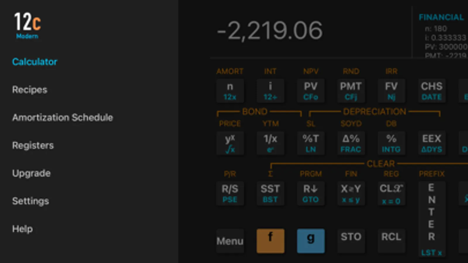 The 12c Modern is a complete reimplementation of the full functionality of the classic HP 12c financial calculator. In addition to providing 12c's look & feel and functionality, we have modernized the app with features such as recipes, interactive prompts, and register views. This free version provides basic Calculator functions, Math functions, Percentage, Calendar and Memory functions. A one-time In-App-Purchase is required to access the Time-Value-of-Money (TVM), Cash Flow, Amortization, Bond, Depreciation, and Statistics functions.
