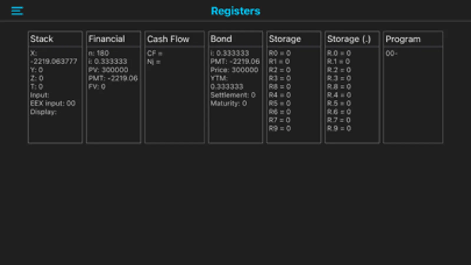 The register views, accessible in the main screen, provides visibility into various register groups. You can switch between different groups of registers (such as Financial, Cash Flow, Bond, etc.), and inspect stored values.