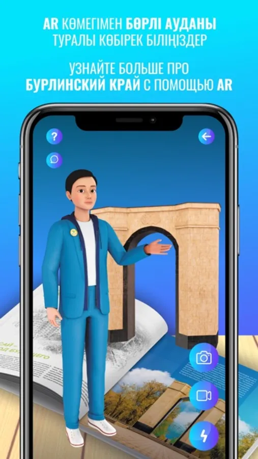 Скачайте бесплатное мобильное приложение AR Aksay и наведите камеру телефона или планшета на 3D-значок на страницах книги «Бөрлі. Қазыналы мекен», чтобы совершить познавательную экскурсию.