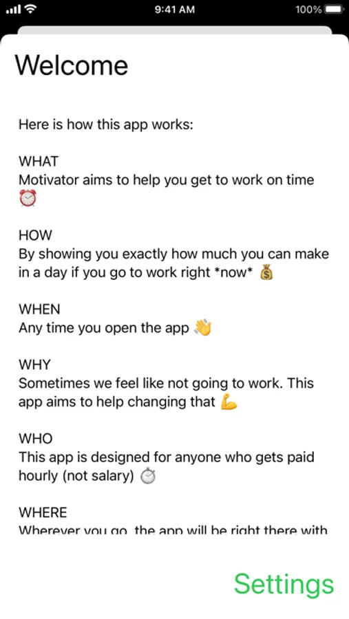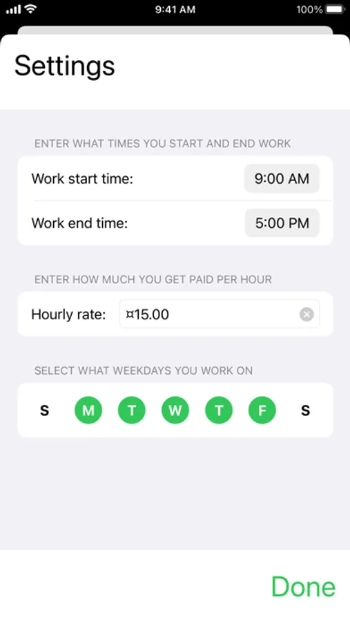 App saves your selected start and end times, working weekdays, and hourly rate, offline