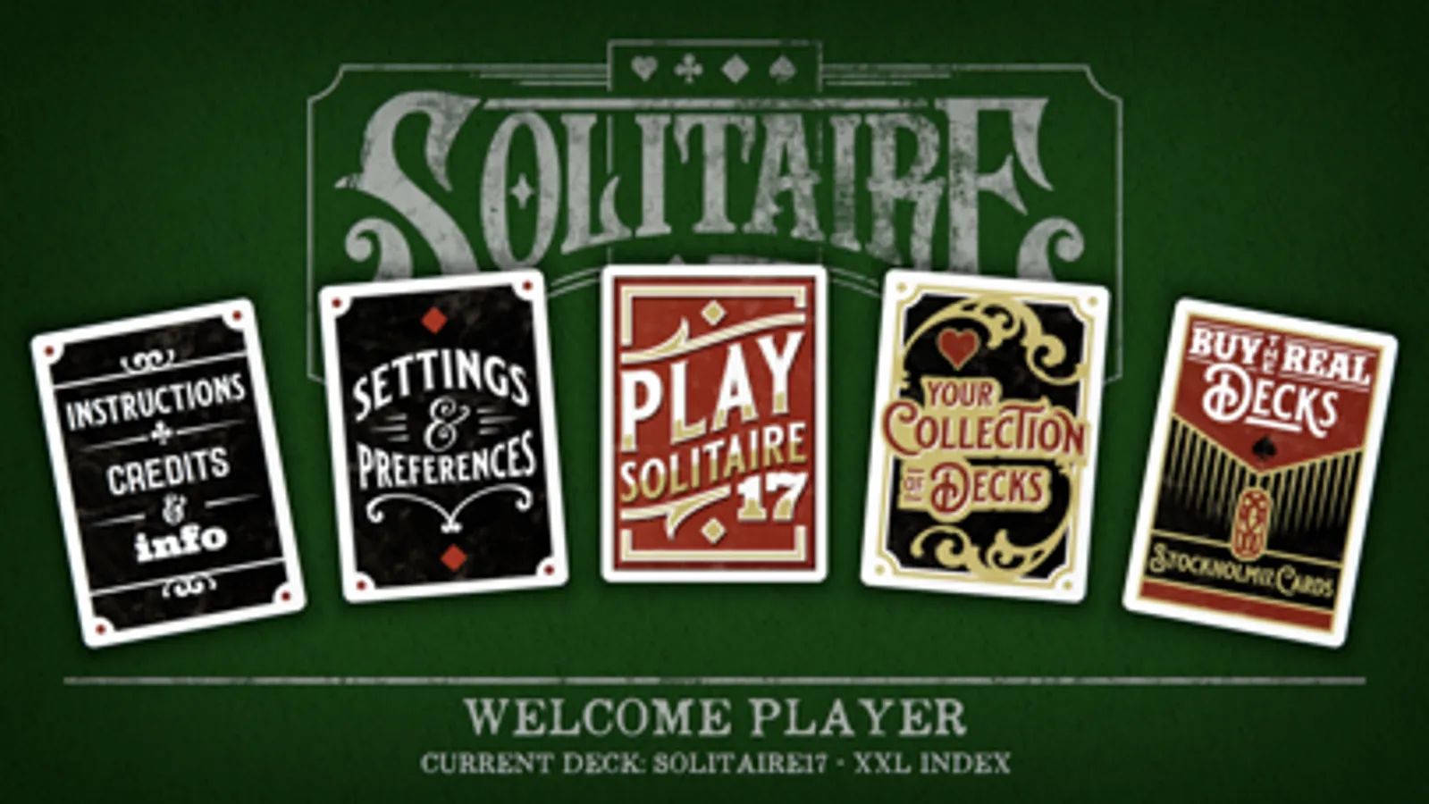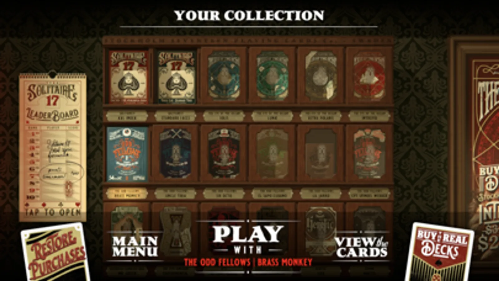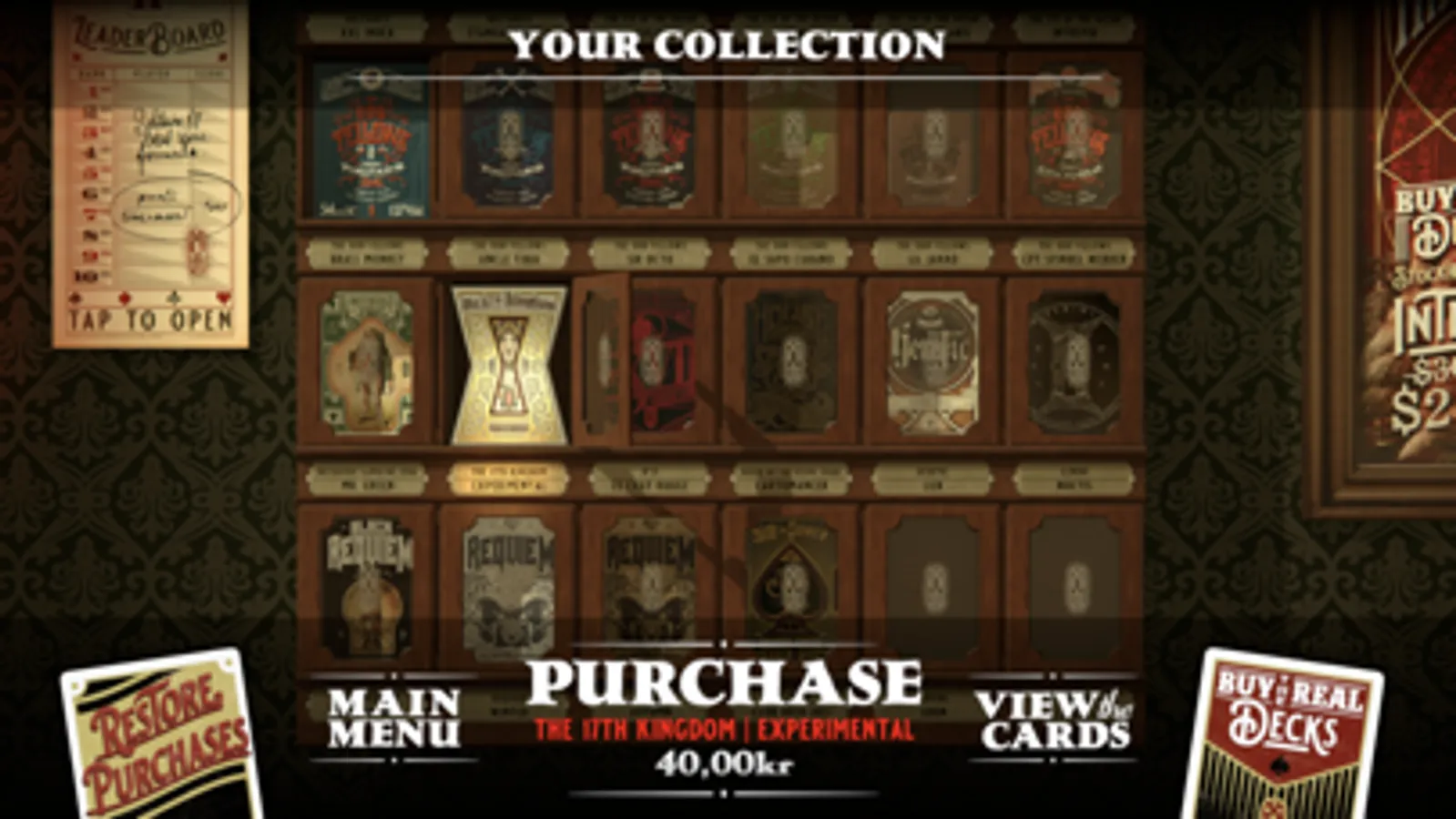 You will navigate your collection and preview the cards of the other custom decks available as in-app purchase. All these decks are designed by Stockholm17 Playing Cards, Sweden. Any custom deck can be used to play the game. Make sure you read the in-game legibility properties of each deck before the purchase, some of them might be hard to read on devices with small screen.