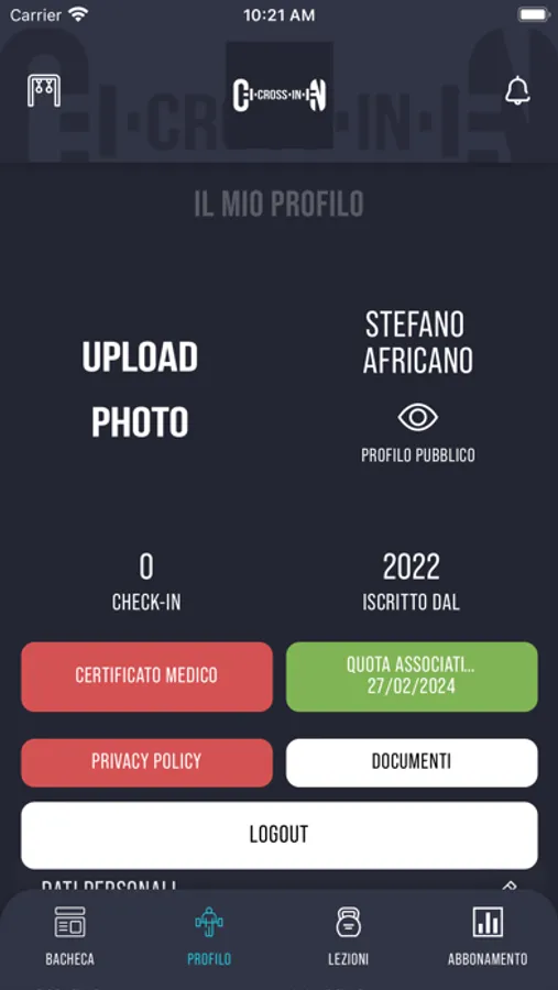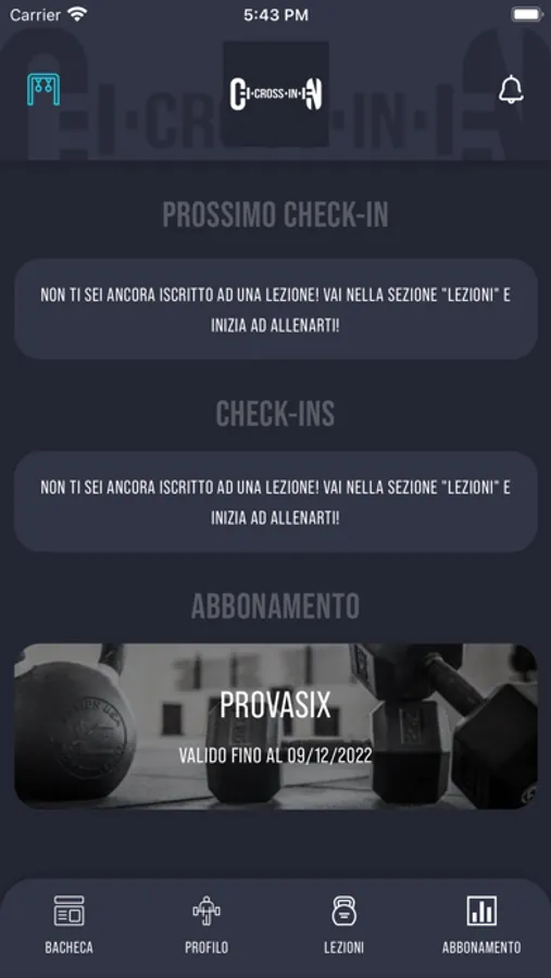Gestisci il tuo profilo con Sport-In. L'attuale release ti permetterà di interagire con la Palestra a cui sei iscritto attraverso la bacheca e le notifiche, registrare i tuoi dati personali, caricare il tuo certificato medico, consultare le classi, fare il check-in alla tua lezione e controllare lo stato del tuo abbonamento.