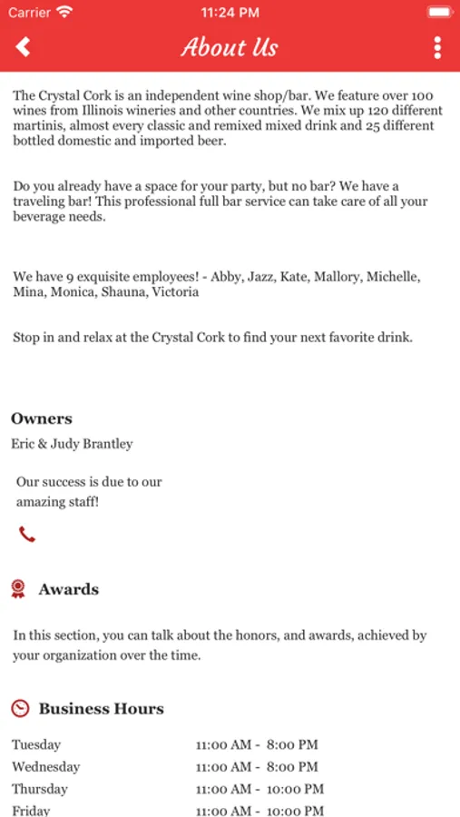 The Crystal Cork's featured drinks including over 100 wines from Illinois wineries and other countries, 125 Martini's, almost every classic and remixed mixed drink and 25 different bottled domestic and imported beer.