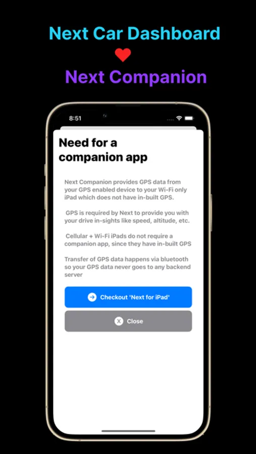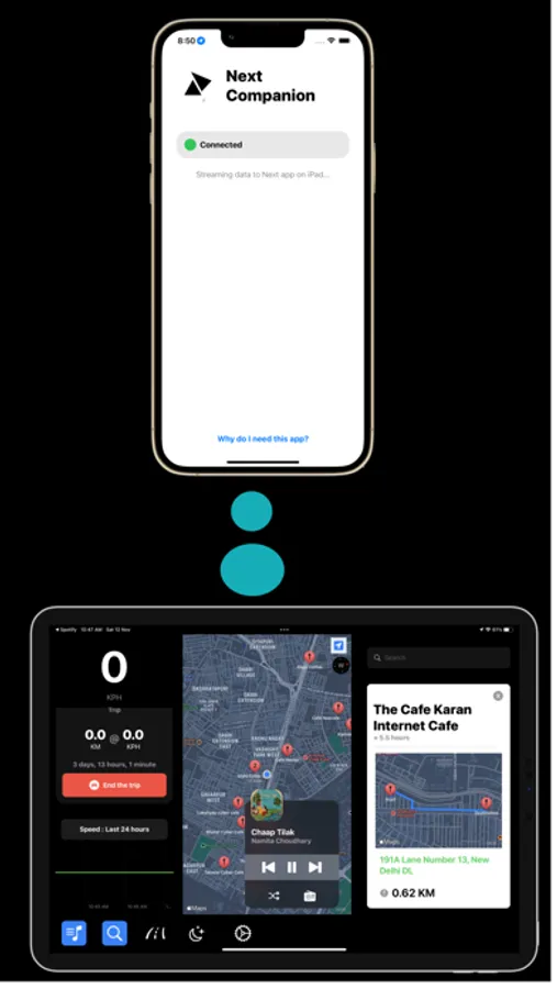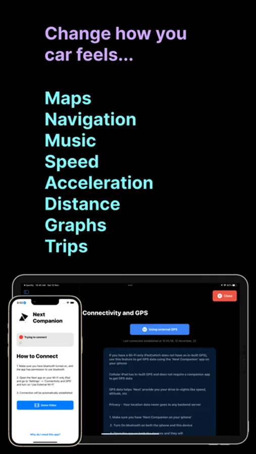 Next Companion provides GPS data from your iPhone to your Wi-Fi only iPad running the ‘Next Car Dashboard’ app.
