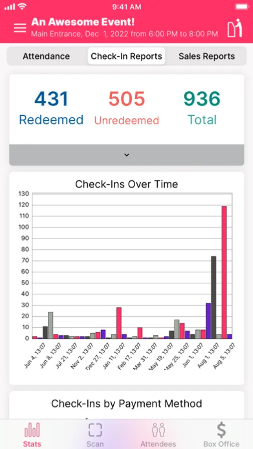 - Up the the minute view of the check-in progress for your event, see how many you have checked in with our easy to read attendance progress bar
