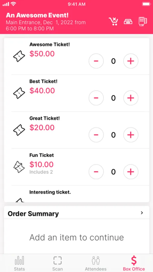 - Allow potential attendees to use the self-service iPad "kiosk mode" to complete their ticket purchase in your venue, or before the event on-premise.