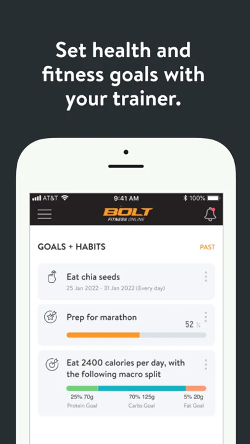 With the BOLT FIT ONLINE App, you will have access to workout programs designed specifically to help you reach your fitness and health goals! You can follow & track your workouts, your nutrition, your lifestyle habits, measurements and results–all with the help of your own coach.