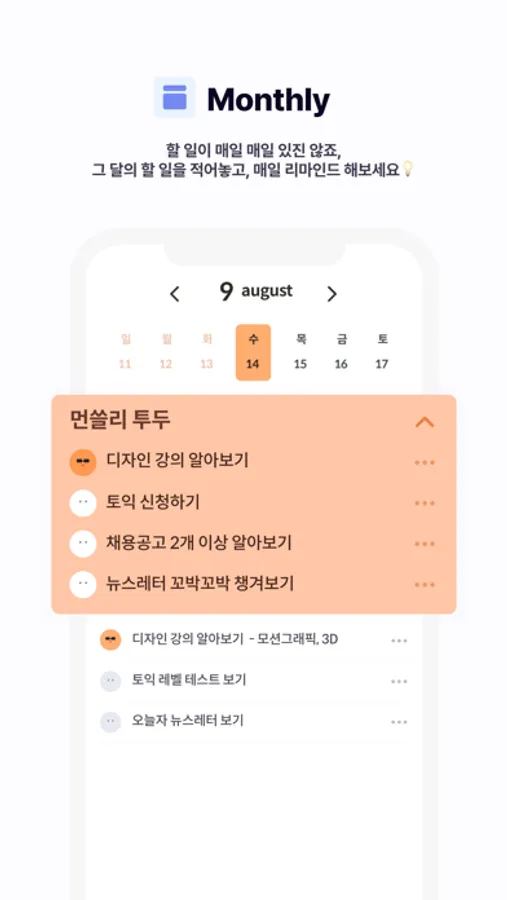 - 늘 미루기만 했던 일들을 '먼슬리 투두'에 써보세요!