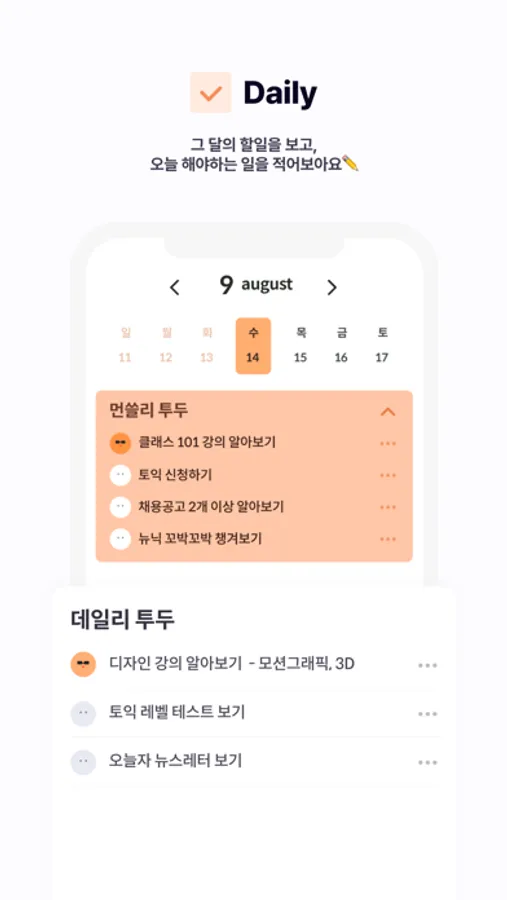 - 먼쓸리 투두를 보고 오늘 해야할 일을 '데일리 투두'에 써보세요!