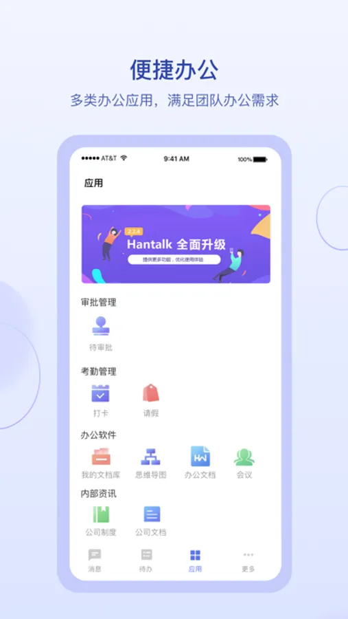 HcTalk整合了即时通讯、项目管理、文档管理、笔记、脑图、音视频会议、智能审批、考勤、工作汇报、日程待办、问卷投票、OKR系统、智能薪酬、HR系统、法务系统、合同管理及公众号推送系统等功能,提供高度定制服务、私有云部署,让企业办公更高效、数据存储更安全。