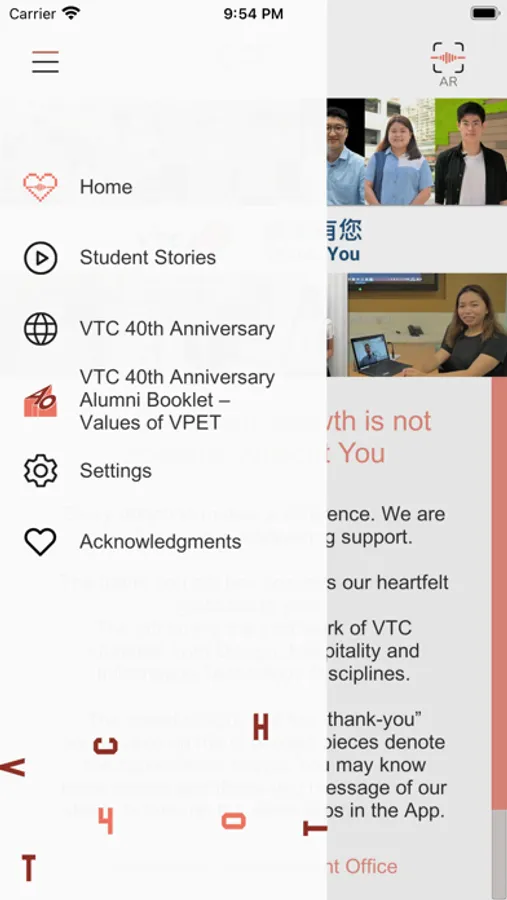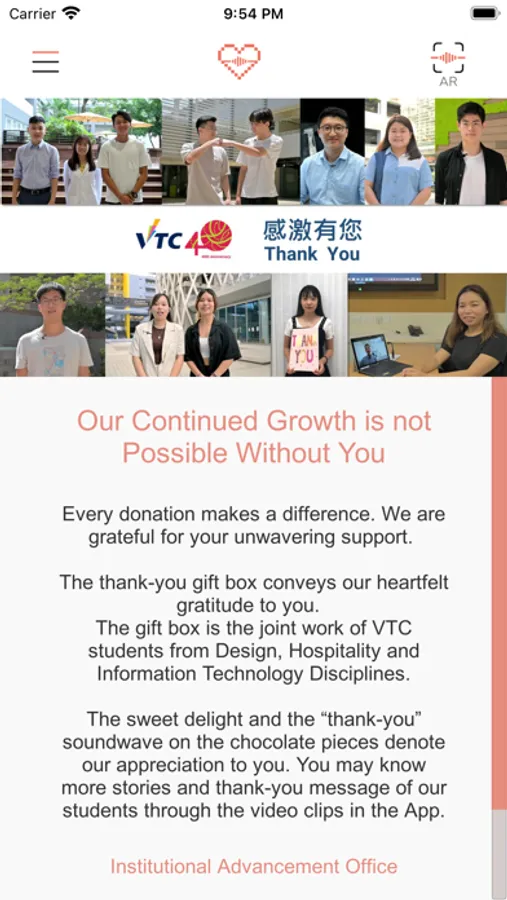學生由衷的銘感言謝代表着對長期以來支持VTC的同行者給予最深切的謝意。 這應用程式是由VTC的設計、酒店和資訊科技學科的高級文憑學生共同開發而成。