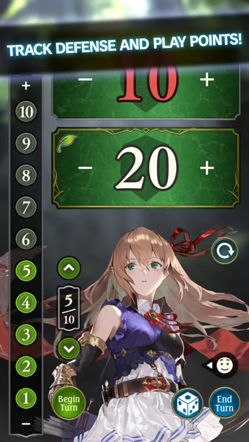 No more memorizing or moving rings on the playmat! Easily keep track of your leader's defense and play points from within the app.