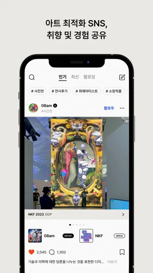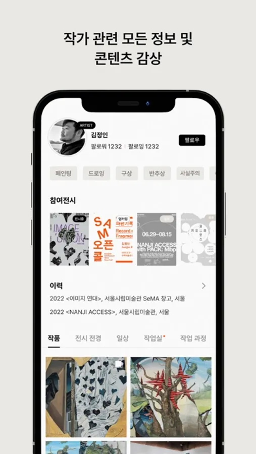 - 전시 후기, 소장 작품, 좋아하는 아티스트 등 아트 취향을 공유하세요.