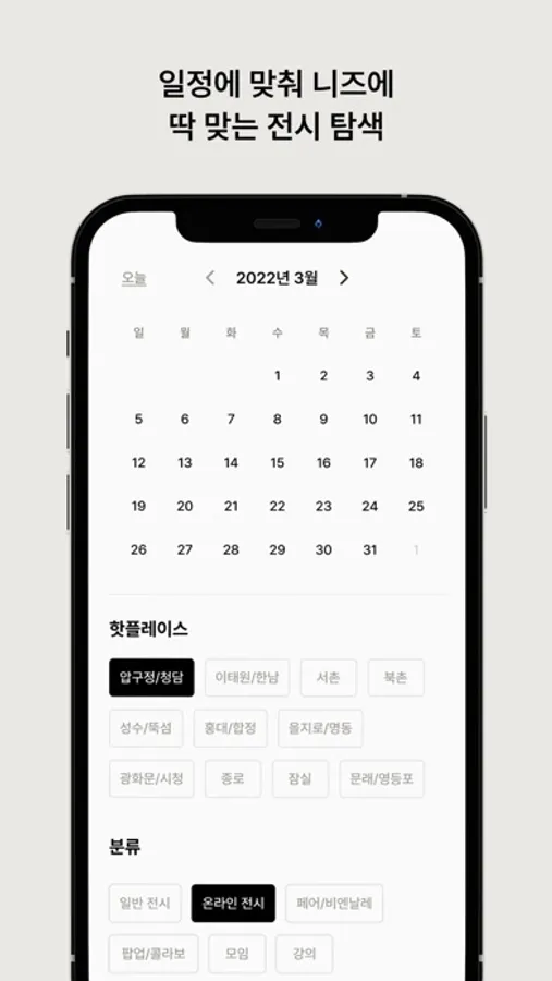 - 취향의 전시를 위치별로, 날짜별로 편하게 탐색하세요.