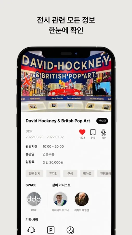 - 전시회 설명, 전시 이미지, 전시 후기, 도슨트 서비스 유무, 주차 정보, 야간개장 유무 등 전시 관람에 필요한 정보들을 모두 한눈에 편하게 확인하세요.