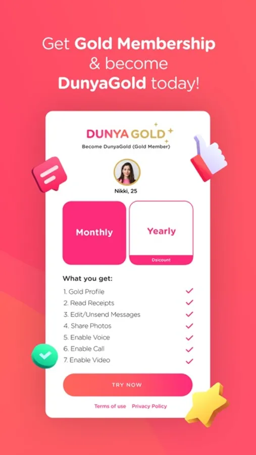 We offer an optional subscription package (DunyaGold) & single or multiple-use paid services for which no subscription is required (SuperLikes, DunyaOnFire).