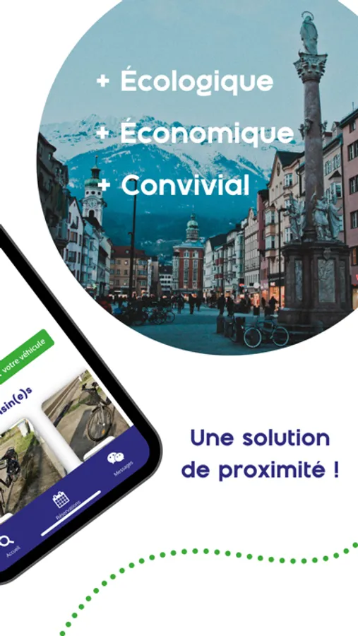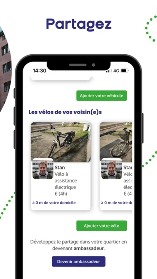 - Vous trouvez dans l'application les véhicules et vélos partagés de votre micro-communauté de voisins. Vous pouvez, si vous le souhaitez, mettre à disposition de vos voisins votre véhicule et/ou vélo.