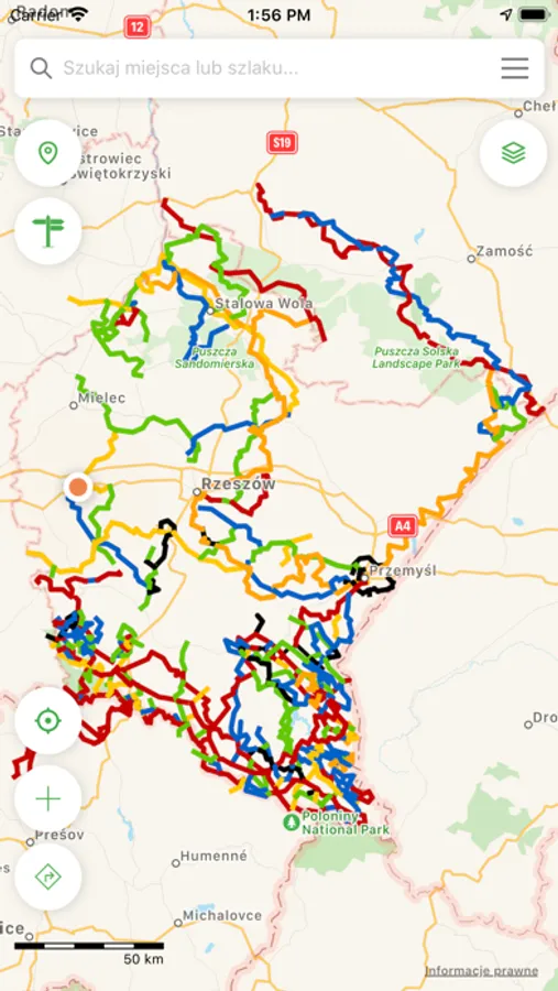 Szlaki pozostałej części województwa podkarpackiego (obszar Bieszczadów oraz Beskidu Niskiego), a także przygraniczne tereny słowackie, znajdziesz w aplikacji mobilnej "Góry bez Granic" i na platformie szlakowej "Góry bez granic".