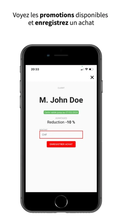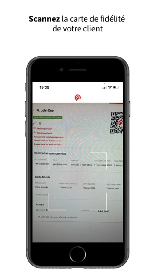 L'application permet de se connecter au compte d'une ou plusieurs entreprises. Il est ensuite possible de scanner le code QR d'une carte fidélité ou chercher un client dans la base de données, et enfin enregistrer les achats du client.
