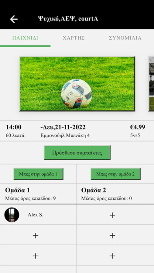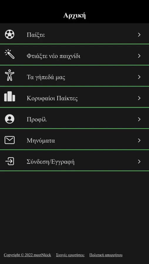 Μέσα από το meet N kick μπορείτε να διοργανώνετε αγώνες ποδοσφαίρου στα γήπεδα μας ή να συμμετέχετε σε αγώνες που έχουν δημιουργήσει άλλοι χρήστες της εφαρμογής, πληρώνοντας το αντίτιμο της συμμετοχής online με τη χρήση πιστωτικής ή χρωστικής κάρτας. Έχετε επίσης τη δυνατότητα να φτιάξετε το δικό σας προφίλ, να συνομιλήστε με άλλους παίκτεμ καθώς και να τιμήσετε συμπαίκτες και αντιπάλους που προσέφεραν μια ευχάριστη ποδοσφαιρική εμπειρία.