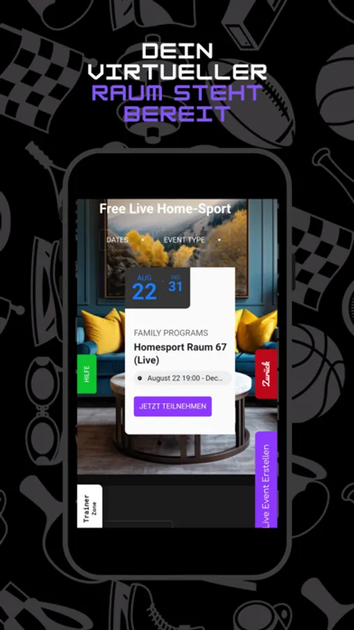Finde im Kalender Home-Sport-Events, an denen du teilnehmen kannst, oder erstelle mithilfe vorgefertigter Trainingspläne deine eigenen Veranstaltungen mit der Kamera. Veröffentliche dein Event entweder öffentlich für bis zu 100 Teilnehmer oder privat für 2 bis 4 Freunde.