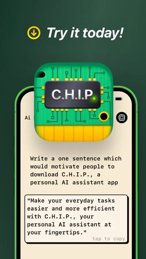 Meet C.H.I.P. - Chatty Helping & Informational Pal, your ultimate AI-powered assistant designed to enhance your daily life! As your trusty sidekick, C.H.I.P. streamlines your tasks, organizes your schedule, and provides instant insights using state-of-the-art artificial intelligence. Enjoy personalized recommendations, lightning-fast translations, and real-time information updates tailored to your unique needs. With C.H.I.P., you'll experience seamless communication, unparalleled organization, and unparalleled convenience in one intuitive app. Embrace the future of personal assistance and transform your everyday routine with C.H.I.P. - the smartest, chattiest companion you'll ever have!