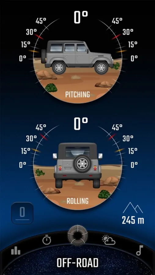 • Off-road. The inclinometer will tell you how much your vehicle is pitch/roll. You can set visual and sound warnings - necessary for driving in rough terrain. In addition, the altitude above sea level is displayed. You can customize the appearance of your vehicle and terrain.