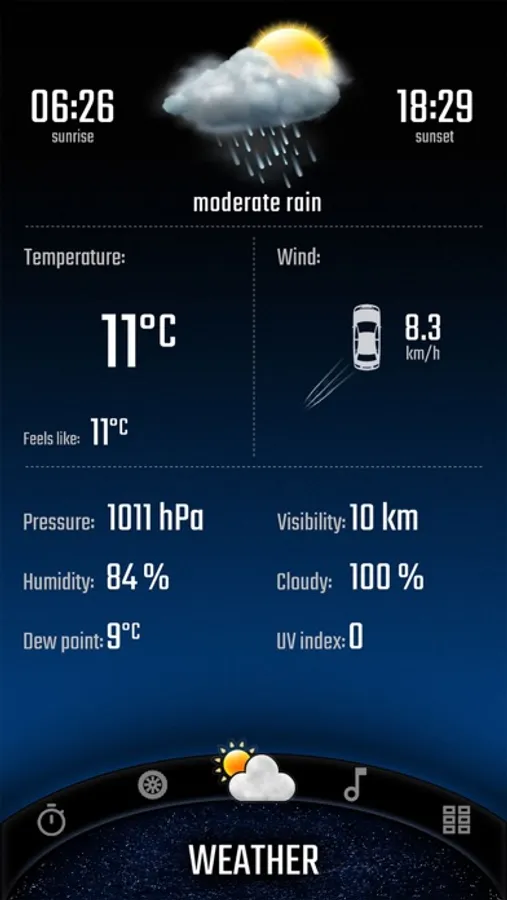 • Current weather that is automatically refreshed based on your location. The most important information for the driver is loaded, including temperature, humidity, cloud cover, visibility and wind direction in relation to the moving car.