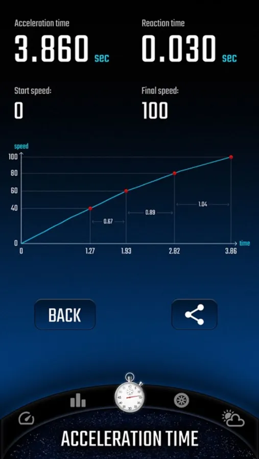 • Acceleration times - with this function you will check the acceleration parameters of your car. You can set any starting and ending speed. During the measurement you will see a graph of the speed to time ratio. An interesting feature is also the measurement of reaction time (the moment of detecting movement from the start signal).