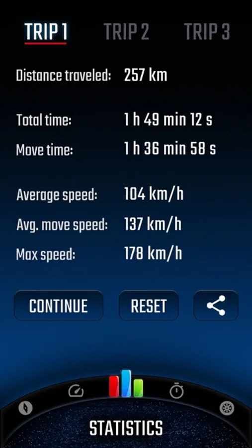 • Statistics. Distance covered, time, average and maximum speed. You can measure all this data for three, independent routes, and then conveniently share with your friends.