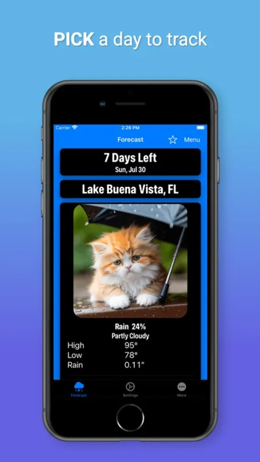 Please Don’t Rain is a fun, convenient way to track whether rain (or snow) will affect a day that’s important to you.