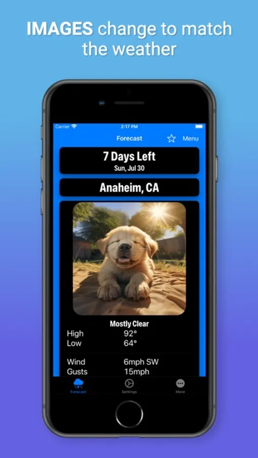 * Beautiful Weather Images - A variety of choices for each weather type that will automatically update to match the predicted weather. Standard weather symbols can also be used instead of these images.